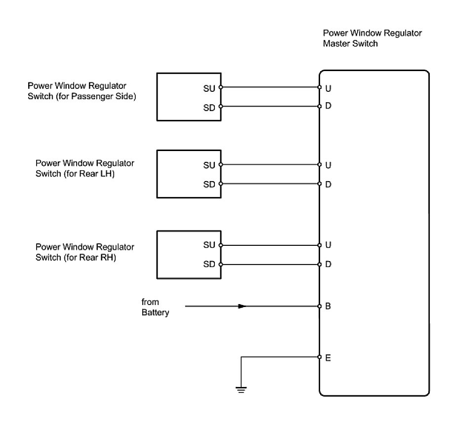 With the ignition switch ON, the power window regulator master switch transmits remote switch signals to the regulator switches of the passenger door power window and rear door power windows. Then, each regulator switch drives its respective power window regulator motor.