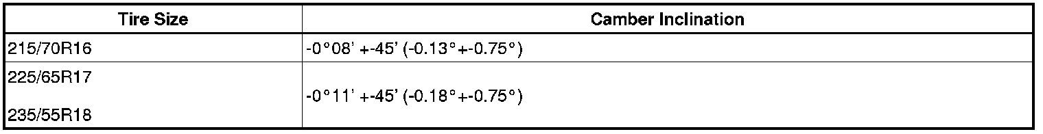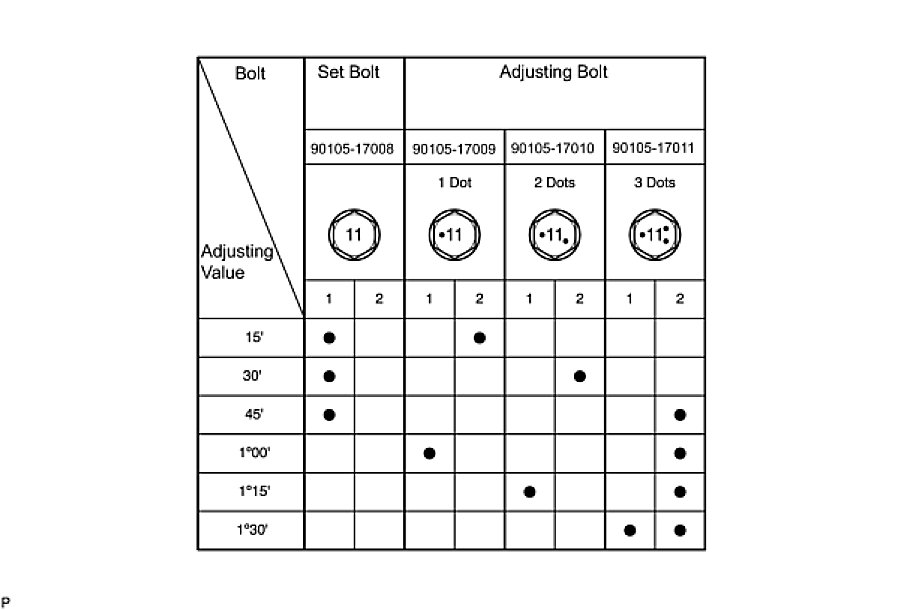 If the camber is not within the specification, estimate how much additional camber adjustment will be required and select the camber adjusting bolt using the following table.