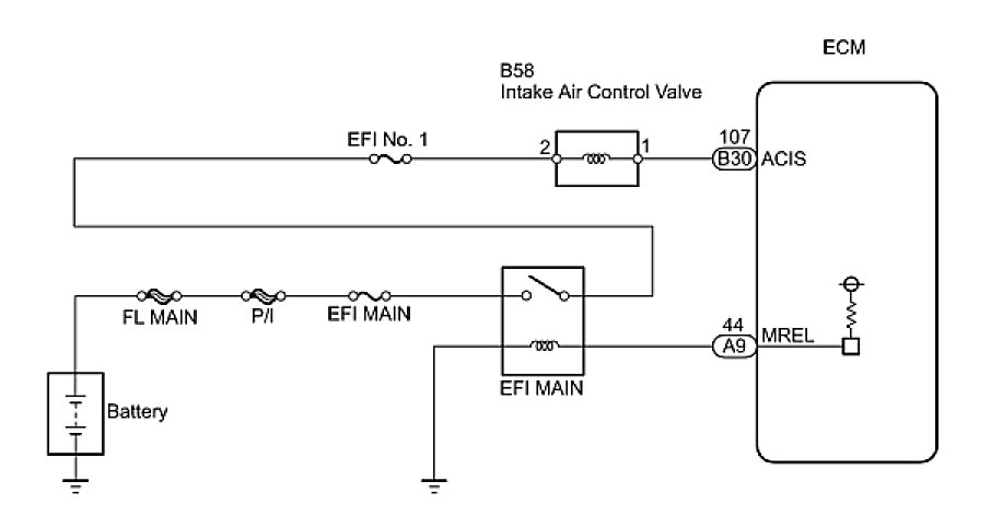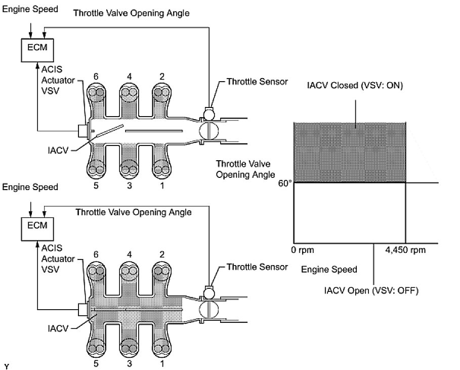 This circuit opens and closes the Intake Air Control Valve (IACV) in response to changes in the engine load in order to increase the intake efficiency (ACIS: Acoustic Control Induction System).