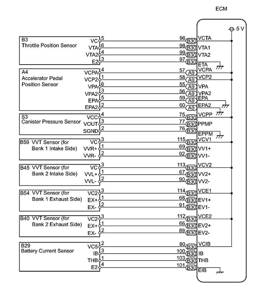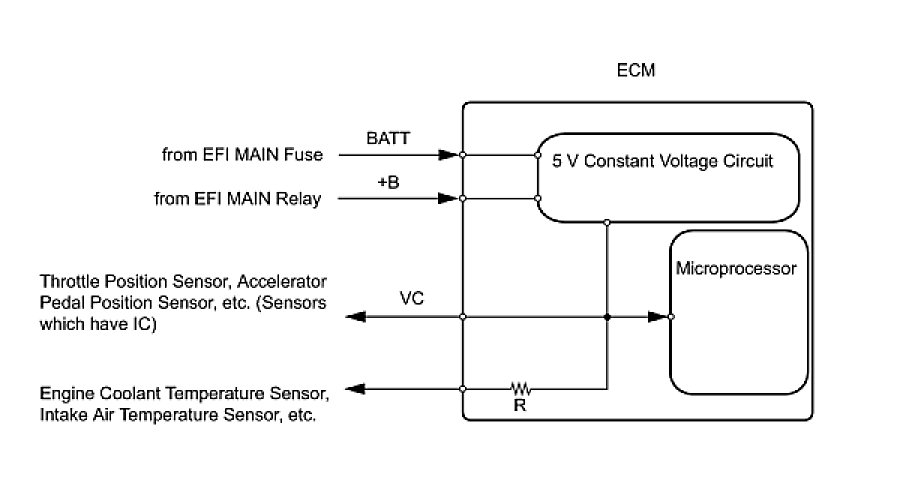 The ECM constantly generates 5 V power from the battery voltages supplied to the +B (BATT) terminal to operate the microprocessor. The ECM also provides this power to the sensors through the VC output circuit.