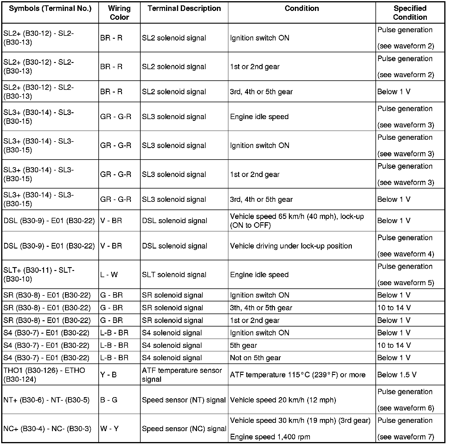 In the table, first follow the information under "Condition". Look under "Symbols (Terminal No.)" for the terminals to be inspected. The standard voltage between the terminals is shown under "Specified Condition".