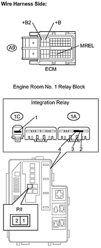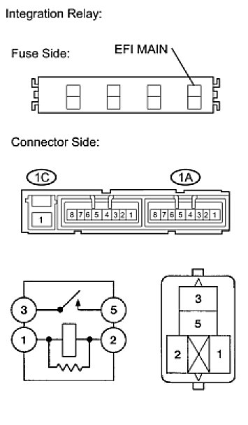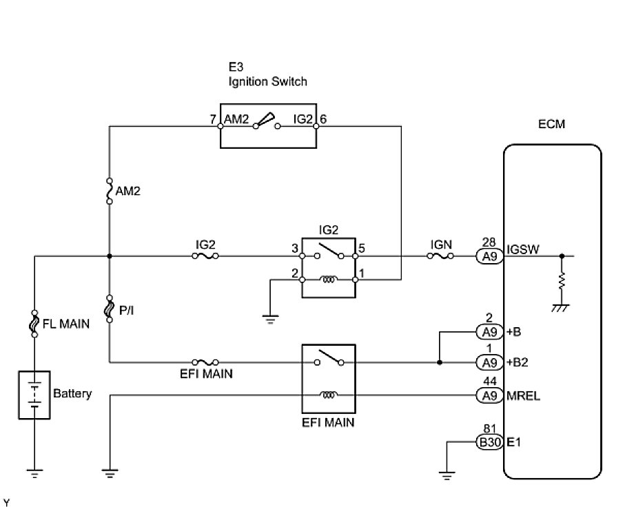 When the ignition switch is turned ON, the battery voltage is applied to the IGSW of the ECM. The output signal from the MREL terminal of the ECM causes a current to flow to the coil, closing the contacts of the integration relay (EFI MAIN relay) and supplying power to either terminal +B or +B2 of the ECM.