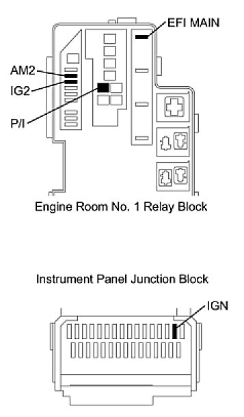(a) Remove the P/I fuse, AM2 fuse, IG2 fuse and EFI MAIN fuse from the engine room No. 1 relay block.