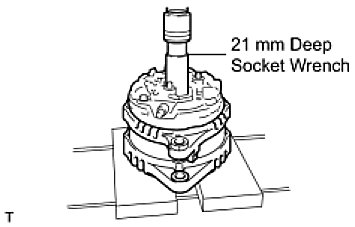 (c) Using a 21 mm deep socket wrench and press, slowly push the generator drive end frame onto the generator rectifier frame.