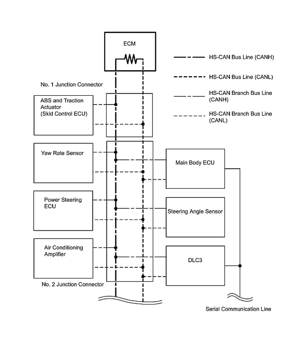 (c) The CAN communication system cannot detect trouble in the branch line of the DLC3 even though the DLC3 is also connected to the CAN communication system.