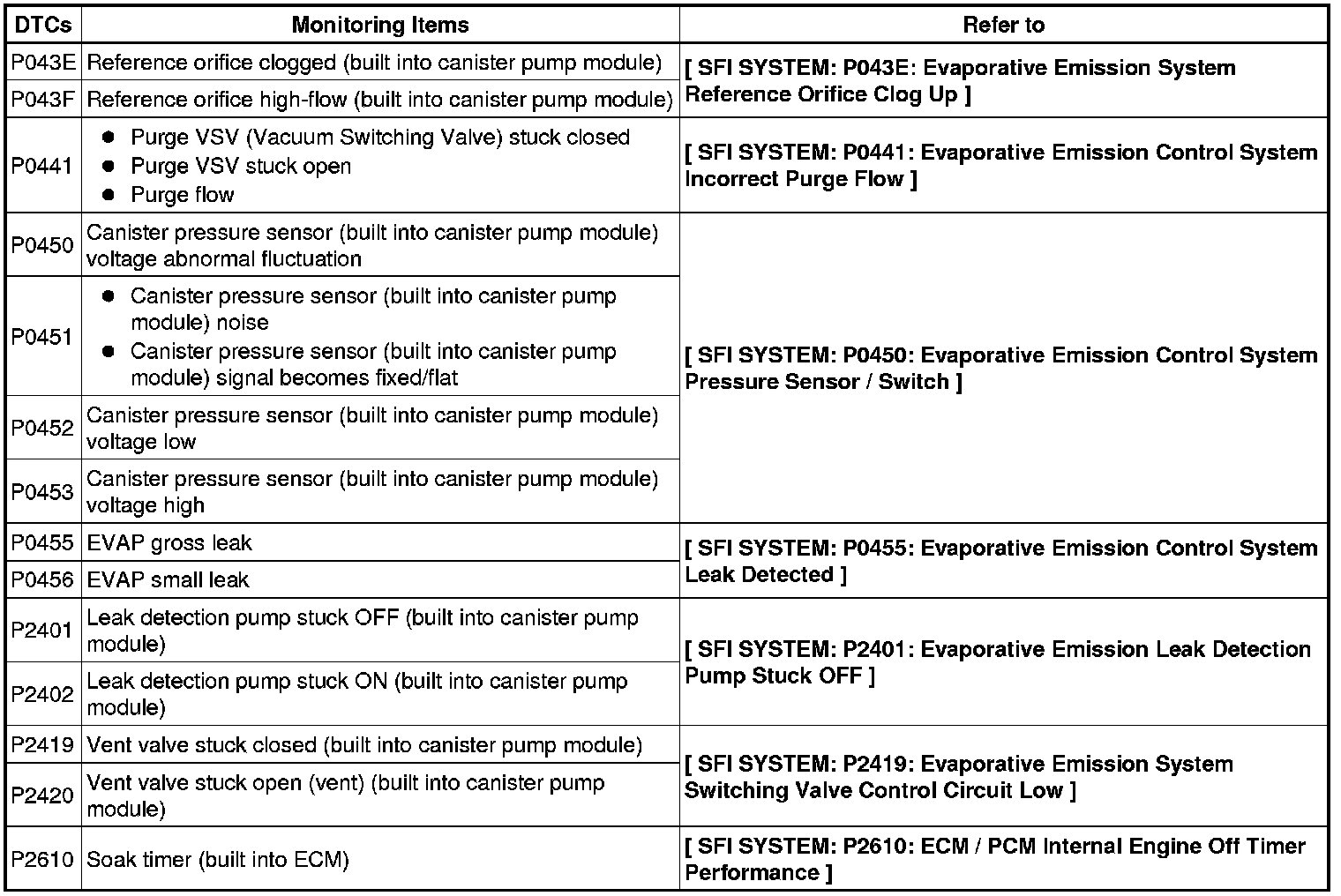 If any EVAP system DTCs are set, the malfunctioning area can be determined using the table below.