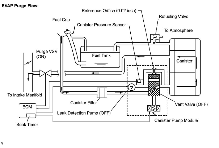 While the engine is running and the purge VSV (Vacuum Switching Valve) is ON (open), the ECM monitors the purge flow by measuring the EVAP pressure change. If negative pressure is not created, the ECM begins the 2nd monitor.