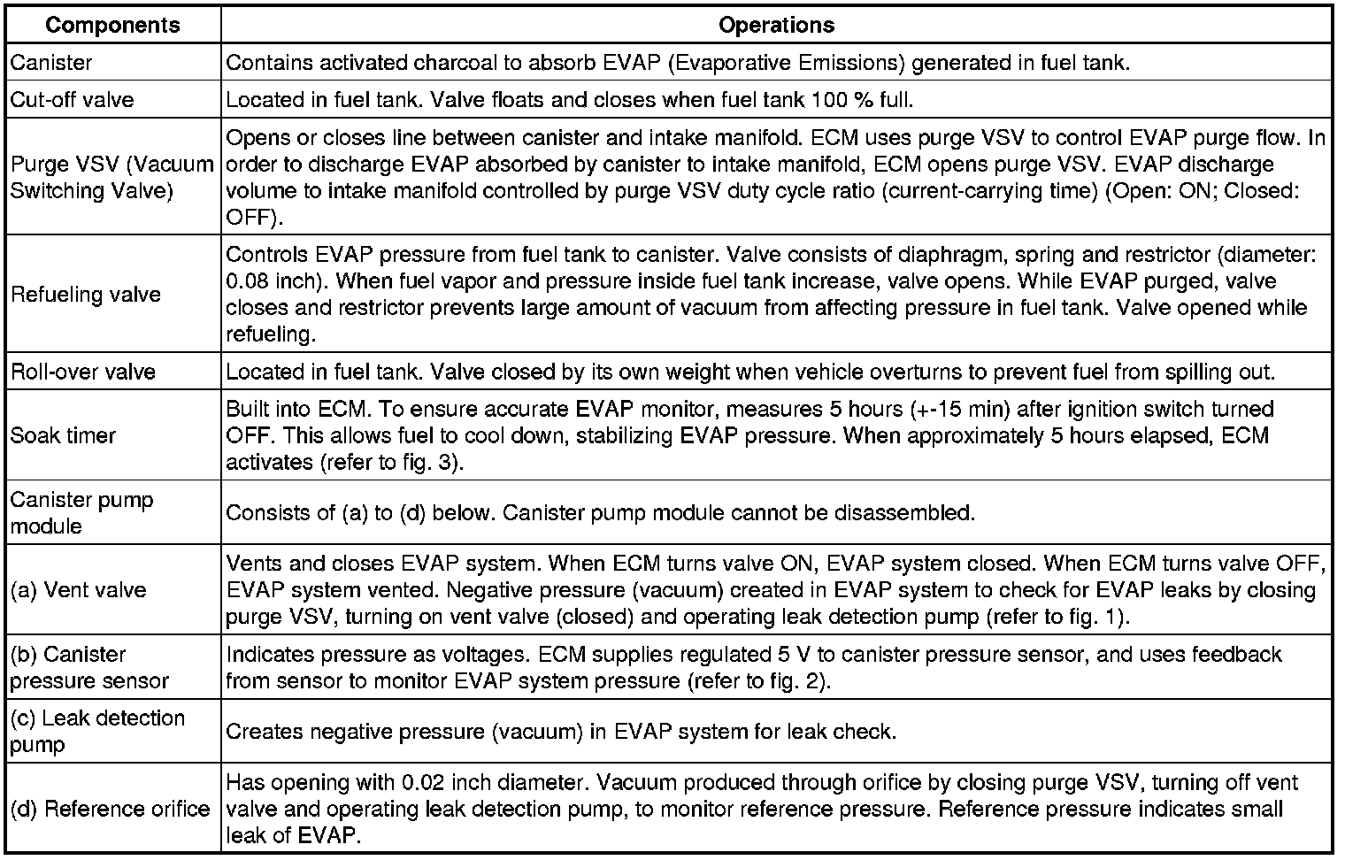 The leak detection pump creates negative pressure (vacuum) in the EVAP system and the pressure is measured. Finally, the ECM monitors for leaks from the EVAP system, and malfunctions in both the canister pump module and purge VSV, based on the EVAP pressure.