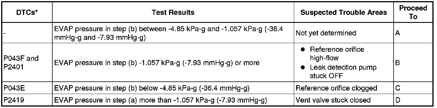 NOTE: If the reference pressure difference between the first and second checks is greater than the specification, all the DTCs relating to the reference pressure (P043E, P043F, P2401, P2402 and P2419) are stored.