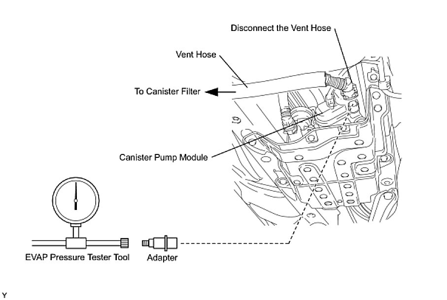 (b) Connect the Evaporative pressure tester tool to the canister pump module with the adapter.