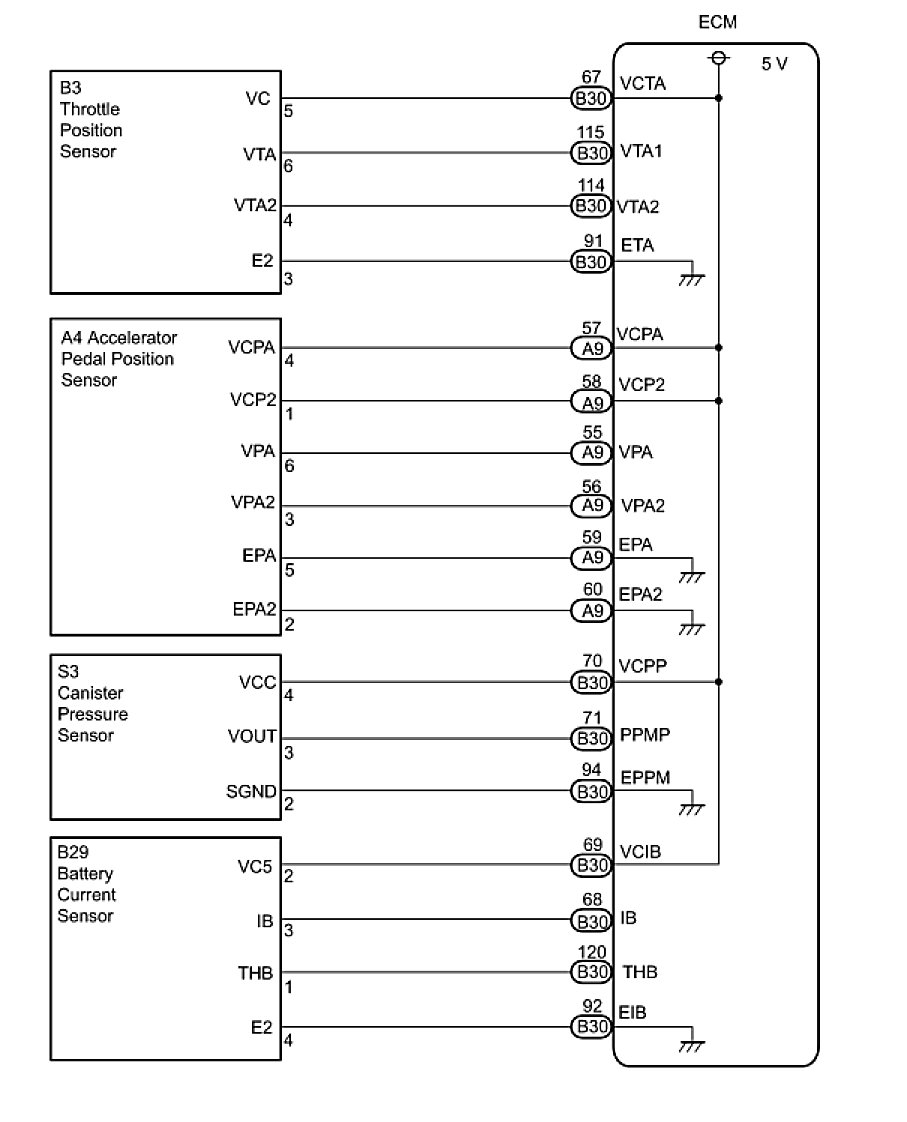 The ECM constantly generates 5 V power from the battery voltages supplied to the +B (BATT) terminal to operate the microprocessor. The ECM also provides this power to the sensors through the VC output circuit.