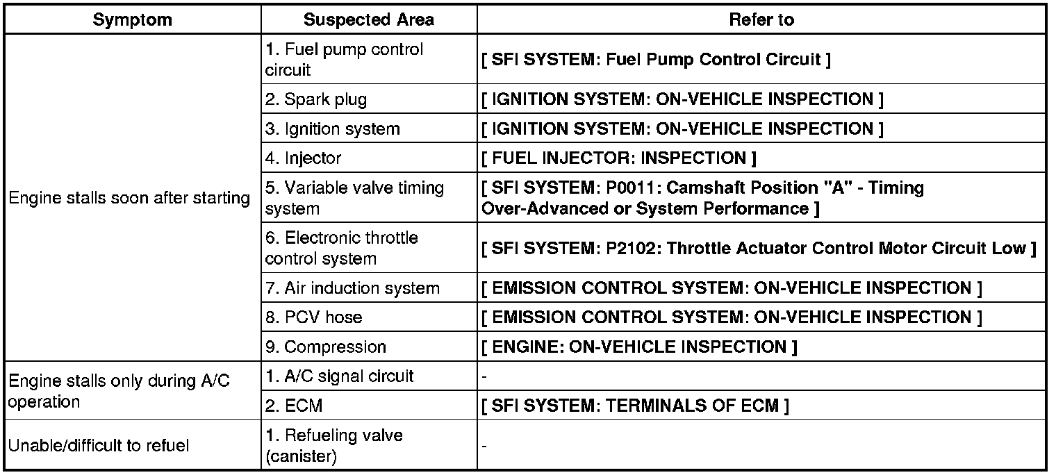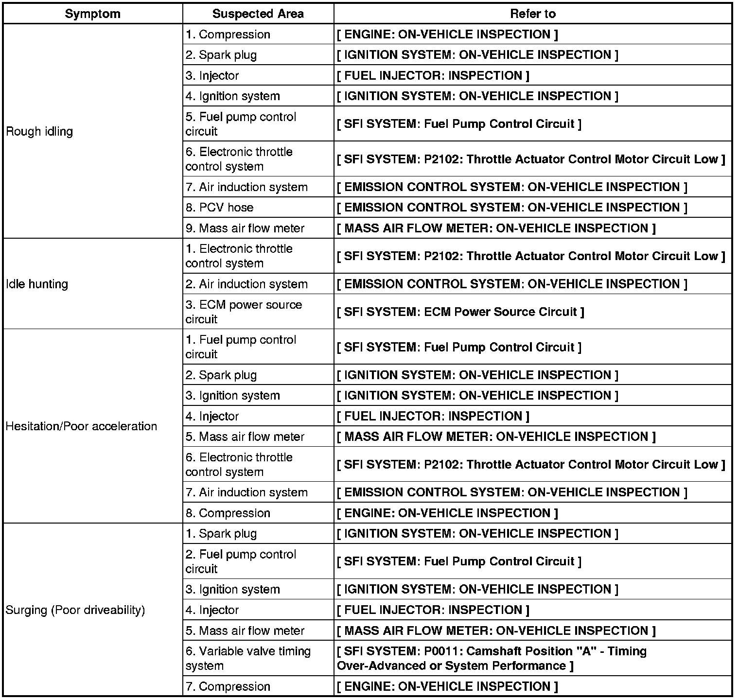 2AZ-FE ENGINE CONTROL SYSTEM: SFI SYSTEM: PROBLEM SYMPTOMS TABLE