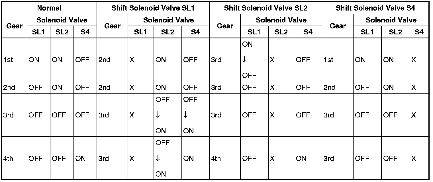 If any of the shift solenoid valve circuits develops an open or short, the ECM turns the other shift solenoid "ON" and "OFF" in order to shift into the gear positions shown in the table below.