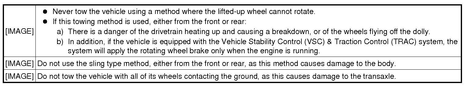 - For example, the towing methods shown below are dangerous or damage the vehicle, so do not use them.
