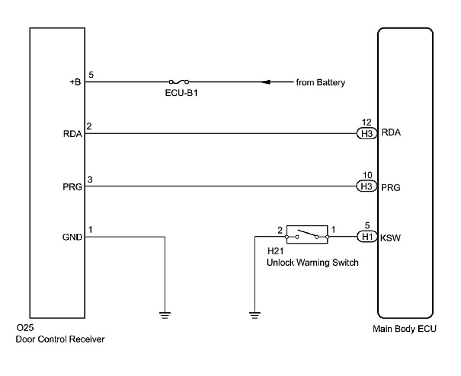 The door control receiver receives signals from the transmitter and sends these signals to the main body ECU. The main body ECU then controls all doors by sending lock/unlock signals to each door, and sends hazard flasher relay signals to the turn signal flasher relay (hazard warning lights).