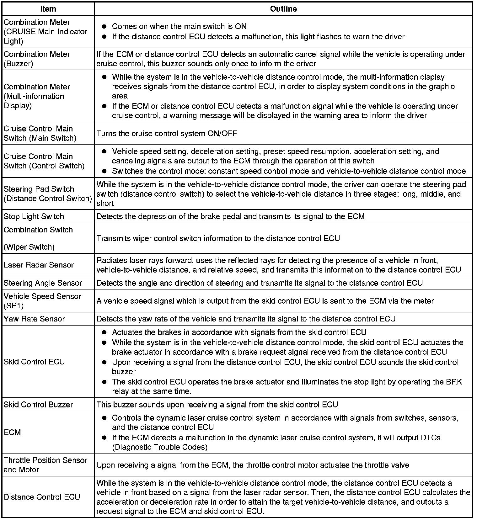 (d) The laser radar sensor and the distance control ECU control the system while the vehicle-to-vehicle distance control mode is in operation, and send signals to each actuator and ECU.