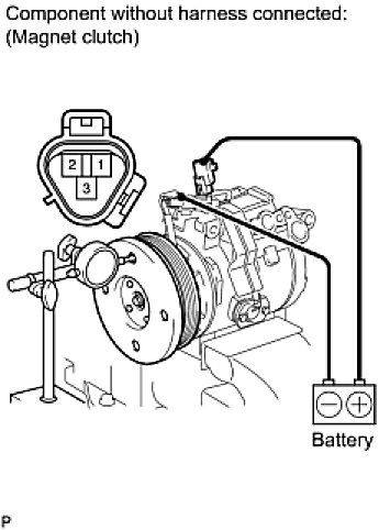 (c) Connect the battery positive lead to terminal 3 of the magnet clutch connector and the negative lead to the ground wire. Turn the magnet clutch on and off and measure the clearance.