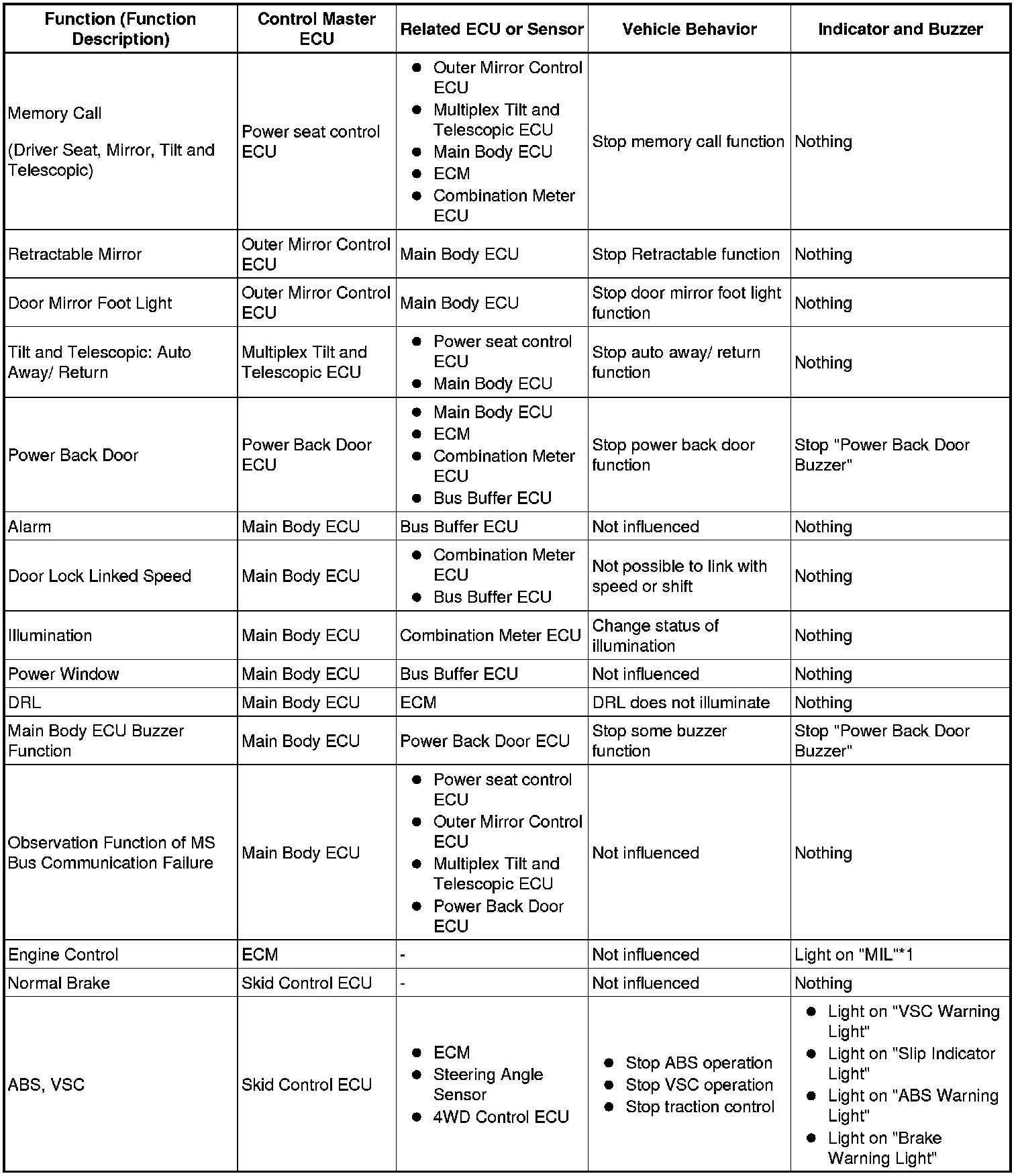 NOTE: *1: MIL lights on only during VSC or ABS failure status.