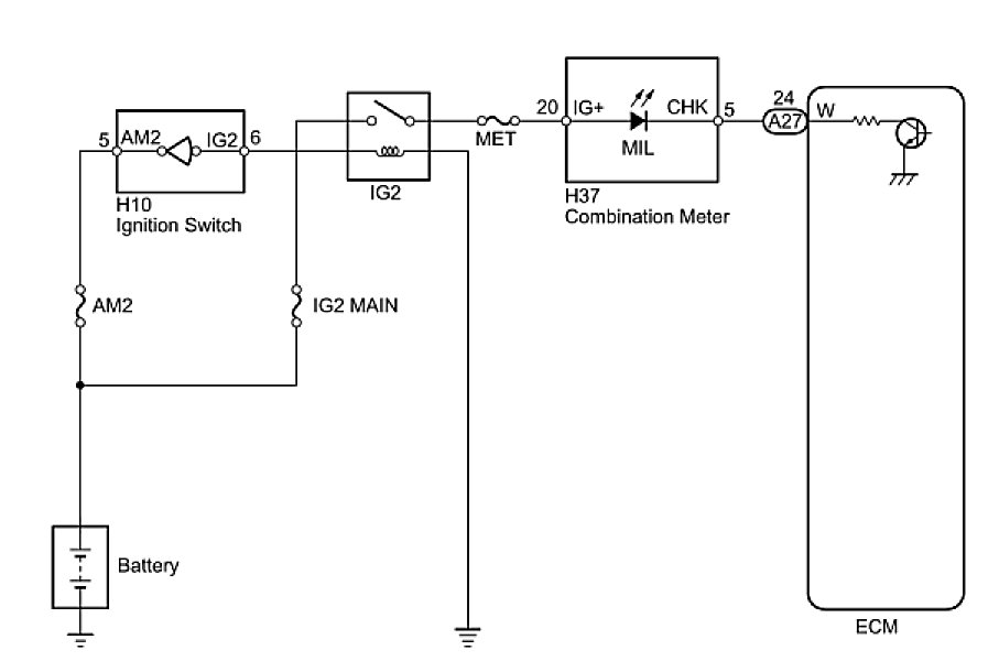 The MIL (Malfunction Indicator Lamp) is used to indicate vehicle malfunction detections by the ECM. When the ignition switch is turned ON, power is supplied to the MIL circuit, and the ECM provides the circuit ground which illuminates the MIL.