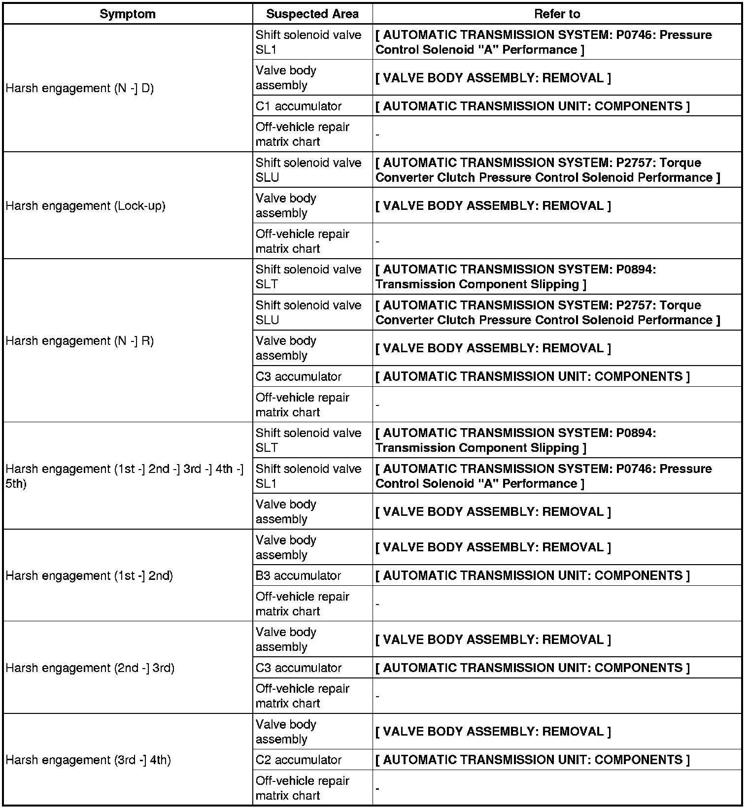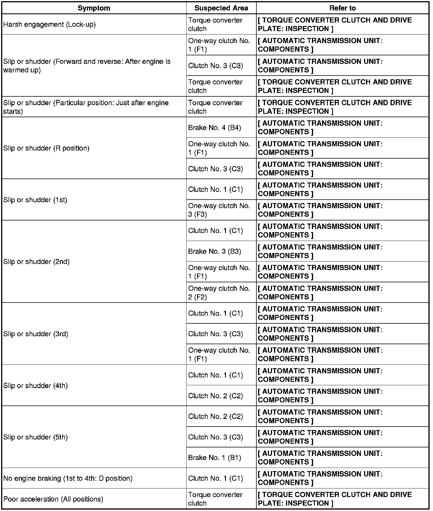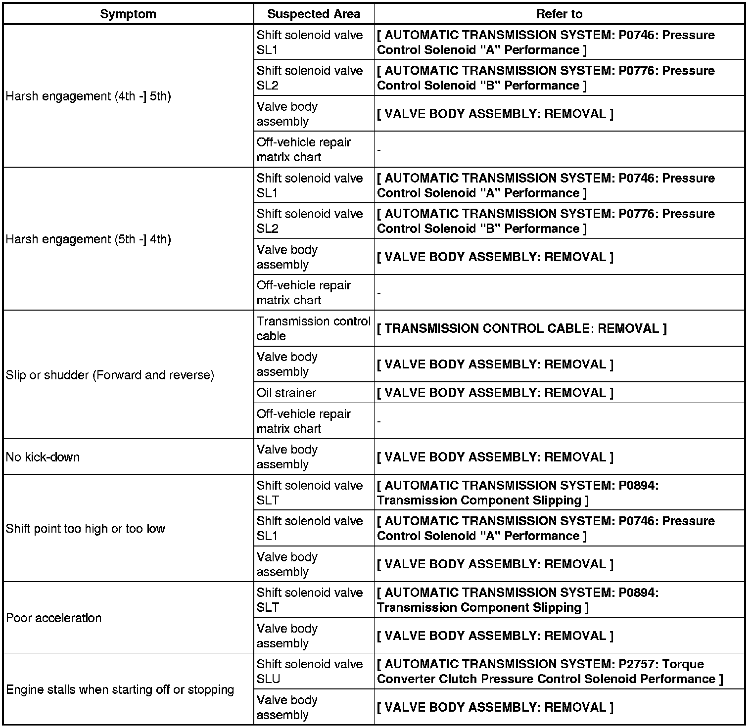 A750E AUTOMATIC TRANSMISSION / TRANSAXLE: AUTOMATIC TRANSMISSION SYSTEM: PROBLEM SYMPTOMS TABLE