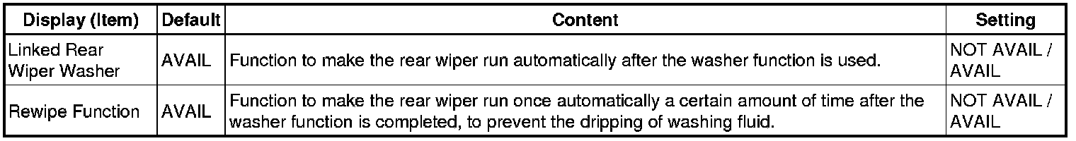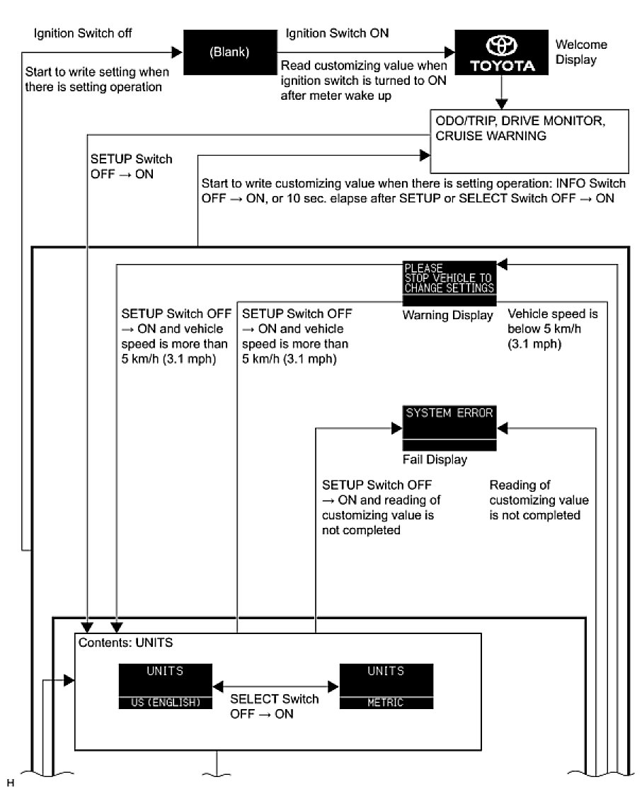 (a) Using the SETUP switch and SELECT switch, the following functions can be customized through the multi-information display. Refer to the illustration below.