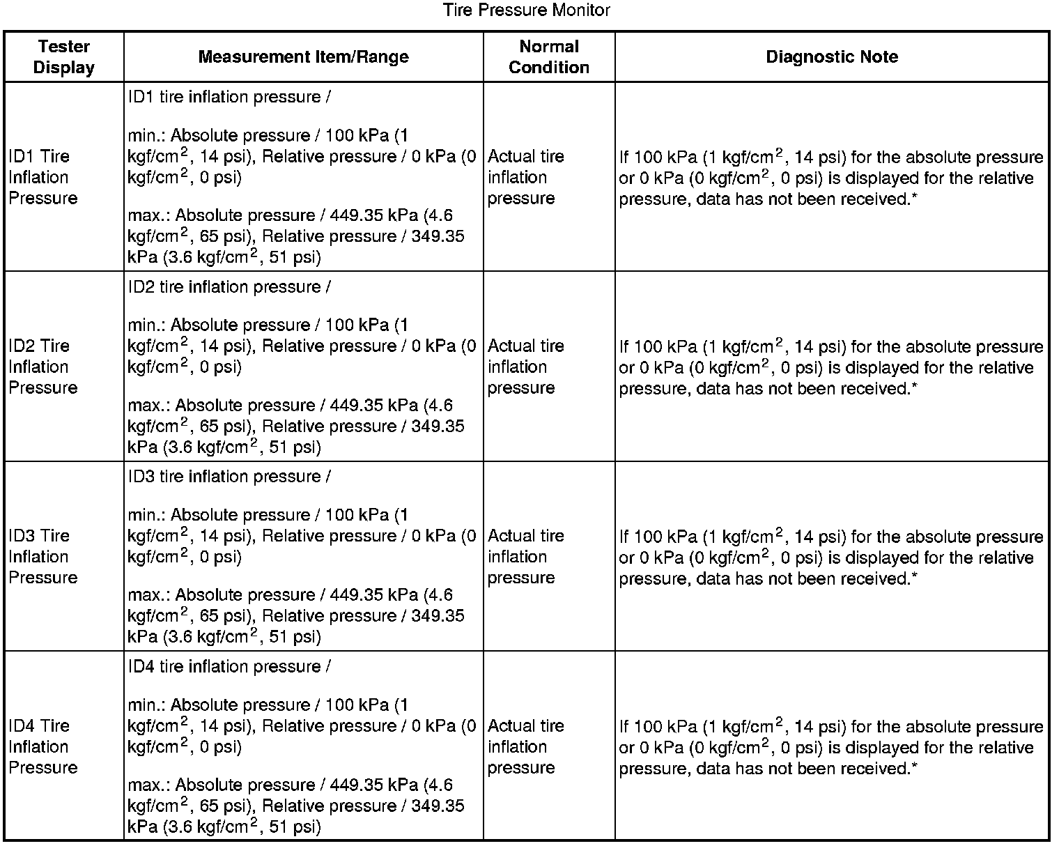 - *: It may take up to about 5 to 6 minutes to update the tire pressure data. If the values are not displayed after about 5 to 6 minutes, perform troubleshooting according to the inspection procedure for DTCs C2121/21 to C2124/24.