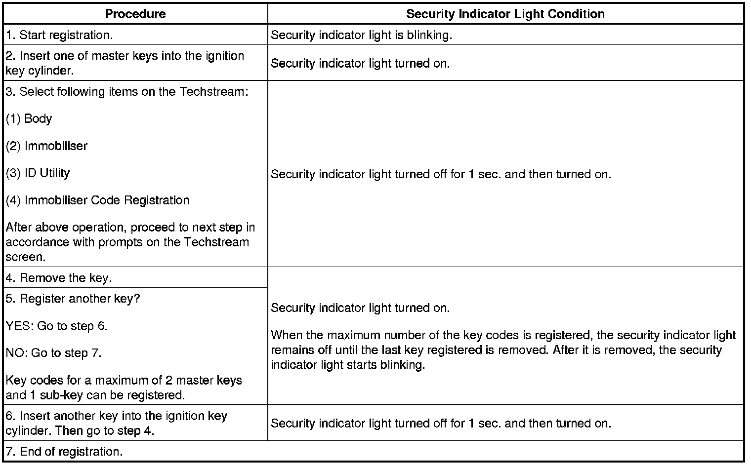 - In this mode, a maximum of 3 key codes for 2 master keys and 1 sub-key can be registered. The master keys and sub-key can be registered in any order because the transponder key ECU can distinguish between different types of keys.