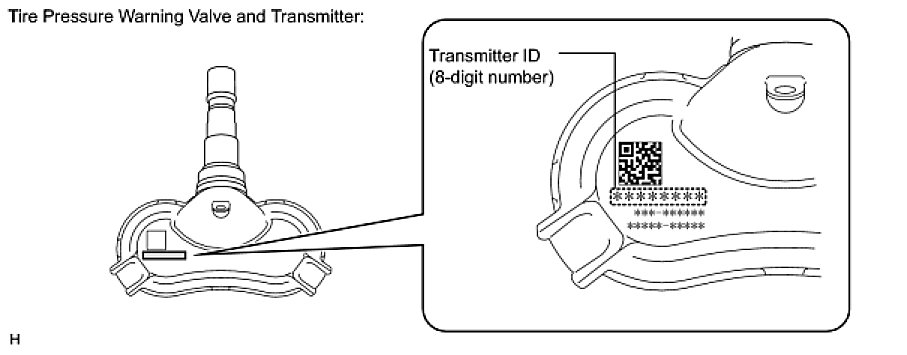 NOTE: The transmitter ID is written on the tire pressure warning valve and transmitter. It will be unable to be read after installing the tire pressure warning valve and transmitter on the tire and wheel. Therefore, take a note of the transmitter ID before installing the tire pressure warning valve and transmitter.