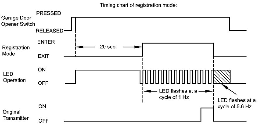 HINT: Before entering registration mode, the LED illuminates. After entering registration mode, the LED flashes at a cycle of 1 Hz (slowly). For a "rolling code" type system, after entering registration mode, the LED flashes at a cycle of 8.8 Hz (very rapidly) for 1.6 seconds, and then the LED flashes at a cycle of 1 Hz.