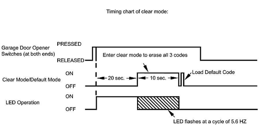 (1) Press and hold the left and right switches of the garage door opener for 20 seconds. The LED will begin to flash at a cycle of 5.6 Hz. Releasing the switches will end clear mode.