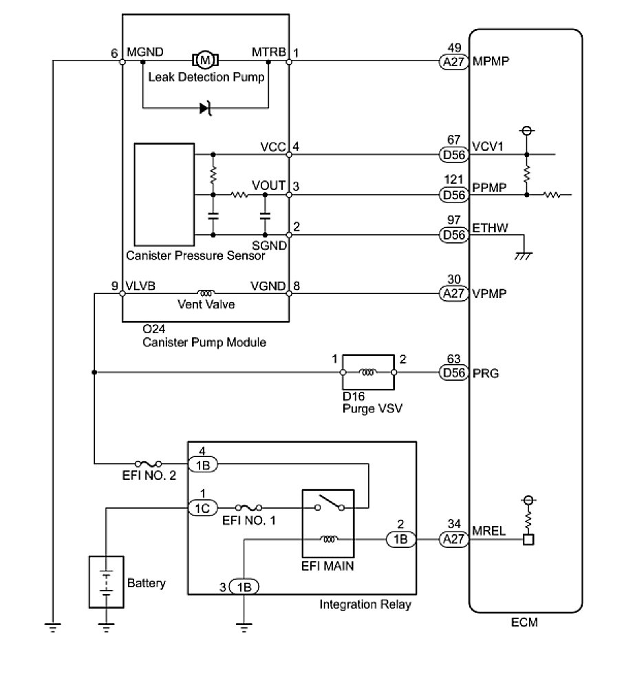 The leak detection pump creates negative pressure (vacuum) in the EVAP system and the pressure is measured. Finally, the ECM monitors for leaks from the EVAP system, and malfunctions in both the canister pump module and purge VSV, based on the EVAP pressure.