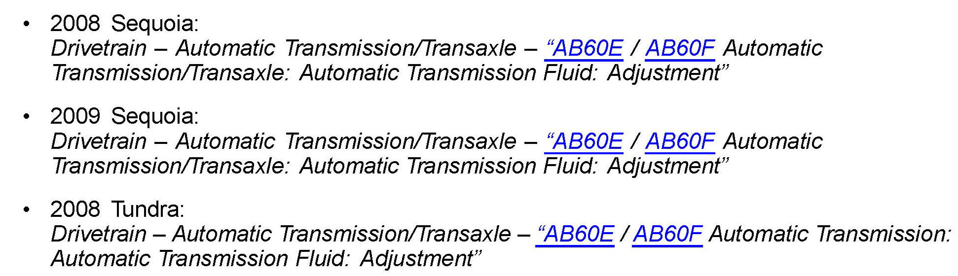 For additional information including animations and video illustrations, please see the Technical Training course E076, Toyota ATF Level Inspection".