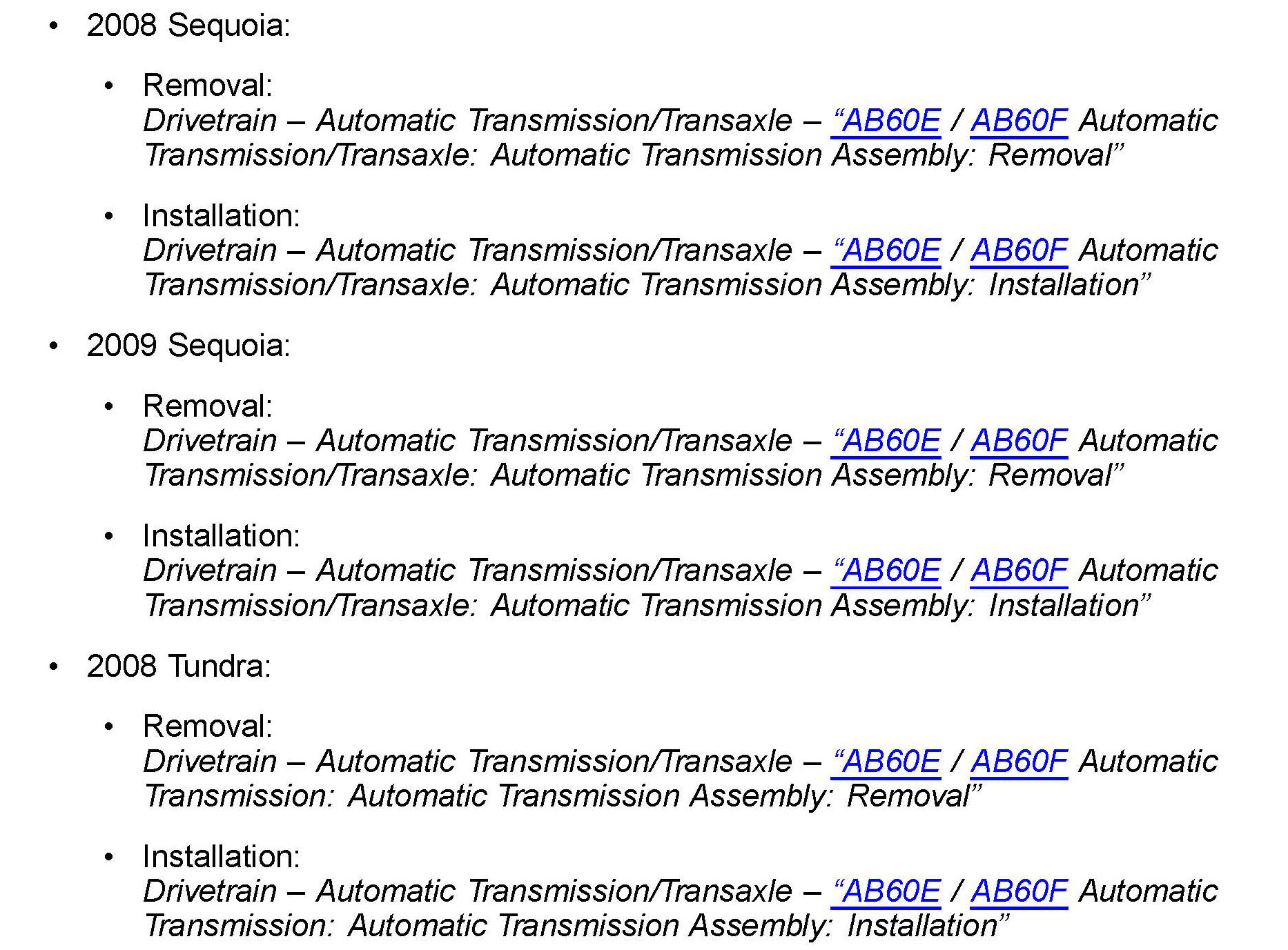 Some Sequoia or Tundra vehicles with AB60 (6 speed) transmissions may exhibit transmission slipping MIL "ON" with transmission shift performance DTCs such as P2714, P0751, P0756, P0761, P0766, P0729, P0781, P0894, or P0776, or harsh shifting due to damage to the C1 clutch assembly. Installation of revised Engine Control Module/ECM (SAE term: Powertrain Control Module/PCM) software logic may be required to repair the vehicle. Follow the repair procedure in this bulletin to address customer concerns.