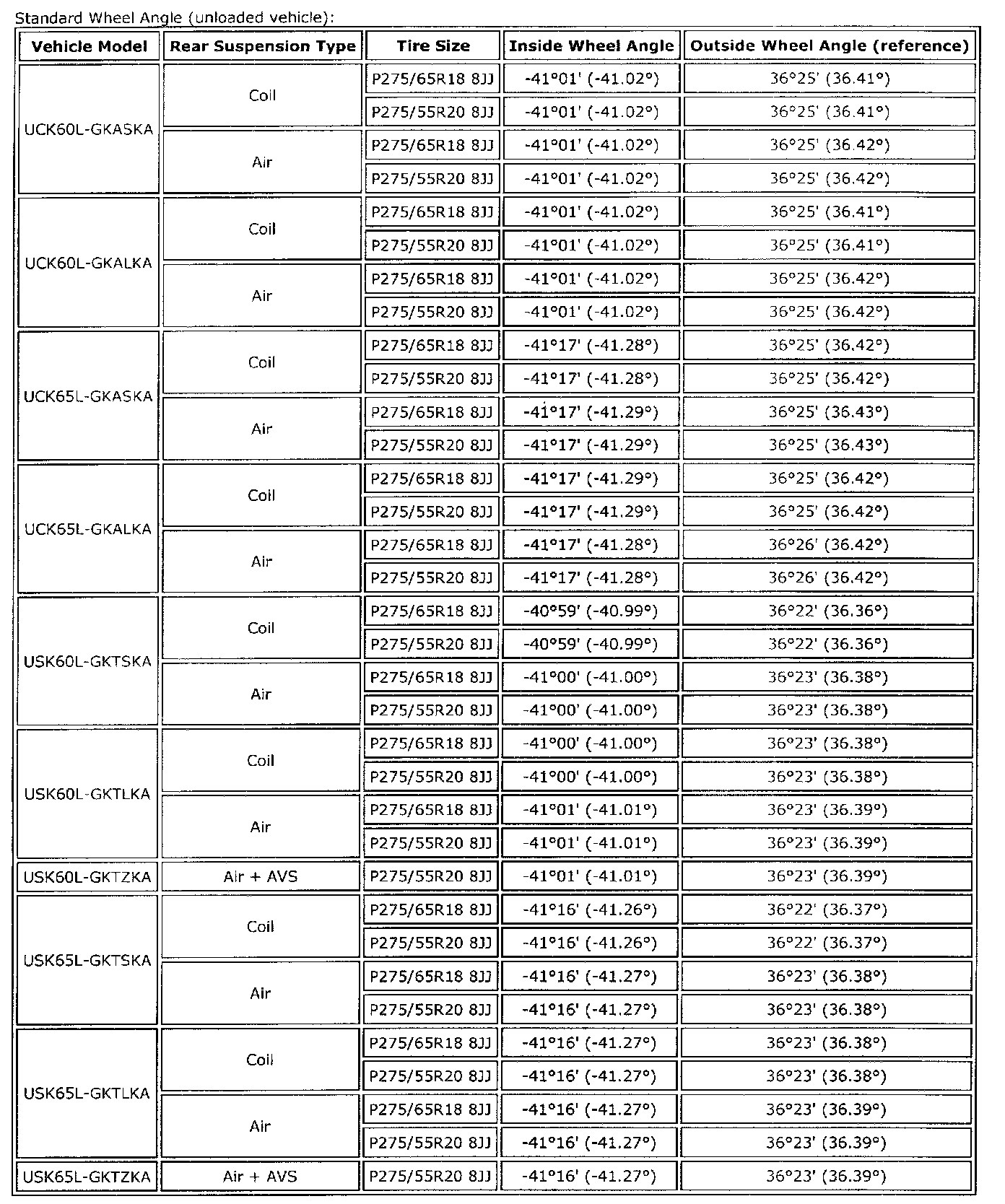 Standard Wheel Angle: