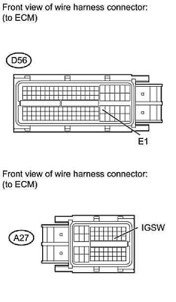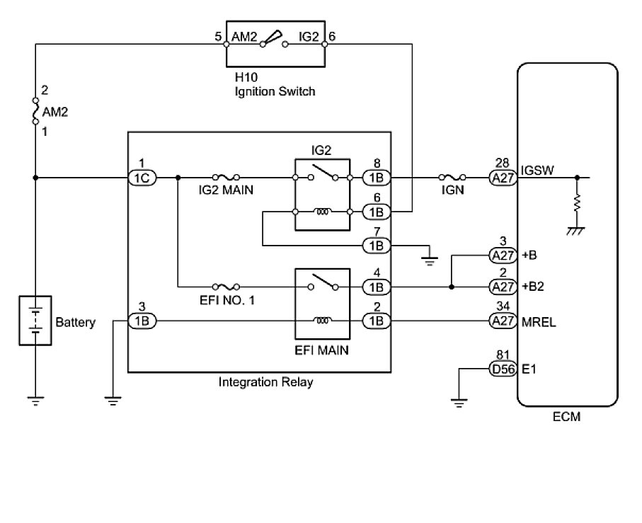 When the ignition switch is turned ON, the battery voltage is applied to the IGSW of the ECM. The output signal from the MREL terminal of the ECM causes a current to flow to the coil, closing the contacts of the integration relay (EFI MAIN relay) and supplying power to either terminal +B or +B2 of the ECM.