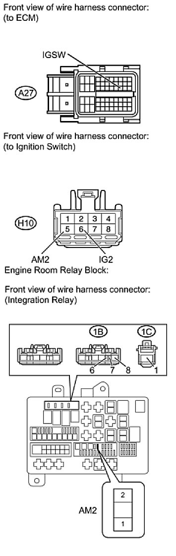 (a) Remove the AM2 fuse, IG2 MAIN fuse, EFI NO. 1 fuse and IGN fuse from the engine room relay block.
