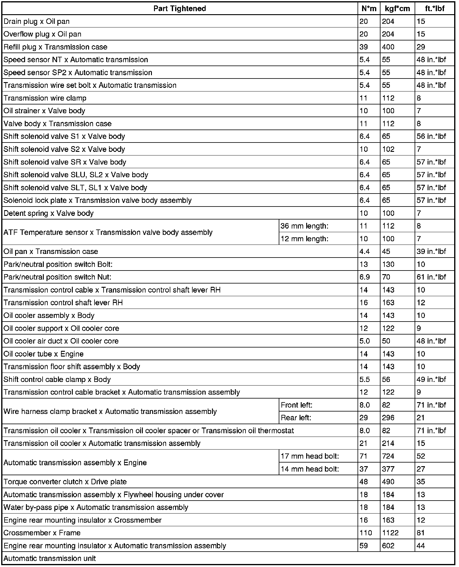 SPECIFICATIONS: A750F AUTOMATIC TRANSMISSION / TRANSAXLE: TORQUE SPECIFICATIONS