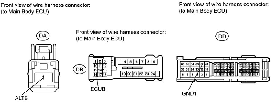 (b) Disconnect the DA, DB and DD main body ECU connectors.