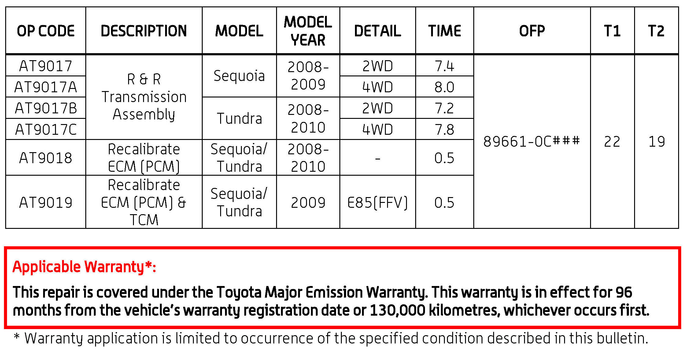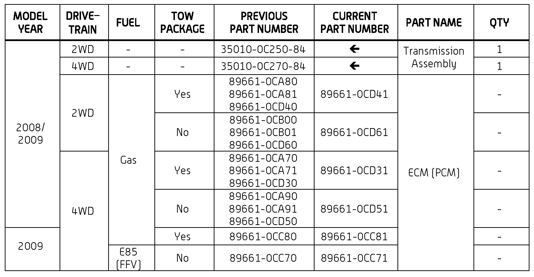 - Applicability has been updated to include 2008 - 2009 model year Sequoia and 2007 - 2009 model year Tundra vehicles.