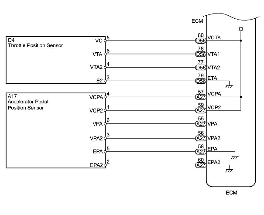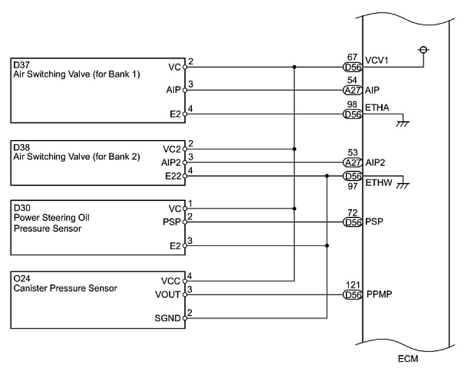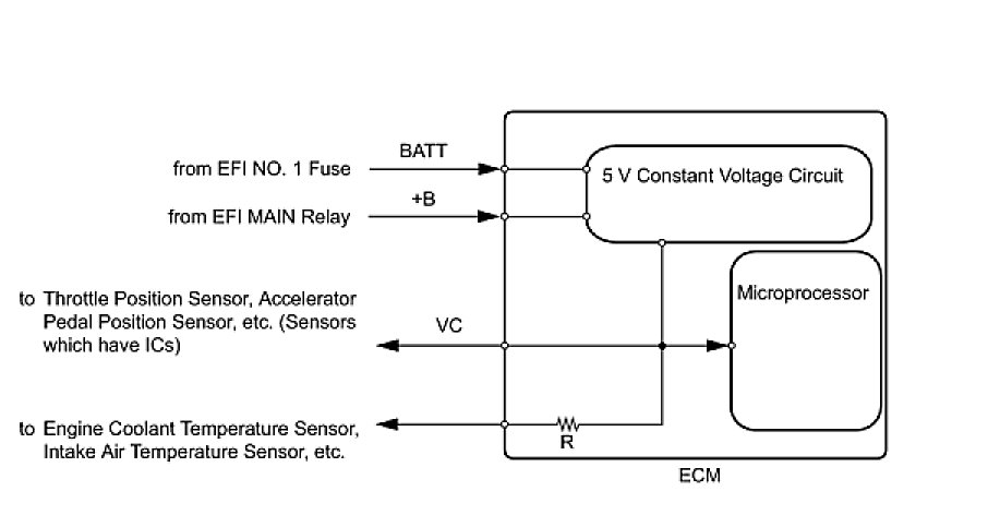 The ECM constantly generates 5 V power from the battery voltages supplied to the +B (BATT) terminal to operate the microprocessor. The ECM also provides this power to the sensors through the VC output circuit.