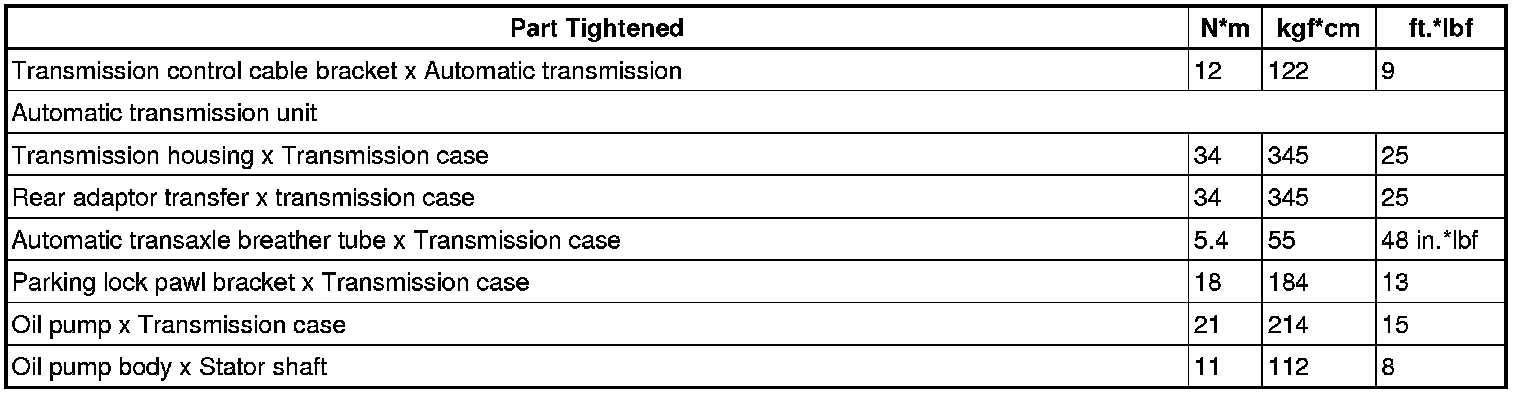 SPECIFICATIONS: AB60F AUTOMATIC TRANSMISSION / TRANSAXLE: TORQUE SPECIFICATIONS