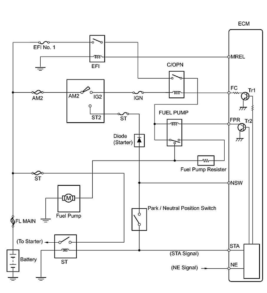 The FUEL PUMP relay switches the fuel pump speed according to the engine conditions. The fuel pump operates when the ECM receives the starter-operating signal (STA) and crankshaft-rotating signal (NE).