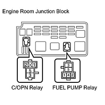 (b) Remove the FUEL PUMP relay from the engine room junction block.