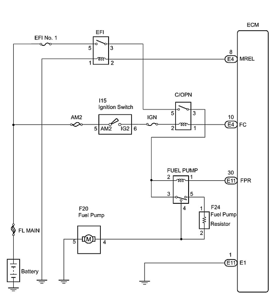 The FUEL PUMP relay is turned ON while the engine is idling or operating at low load. This causes current to flow through the fuel pump resistor to the fuel pump. The fuel pump then operates at low speed. The FUEL PUMP relay is turned OFF while the engine is cranking or operating at high load. The fuel pump then operates at normal speed.