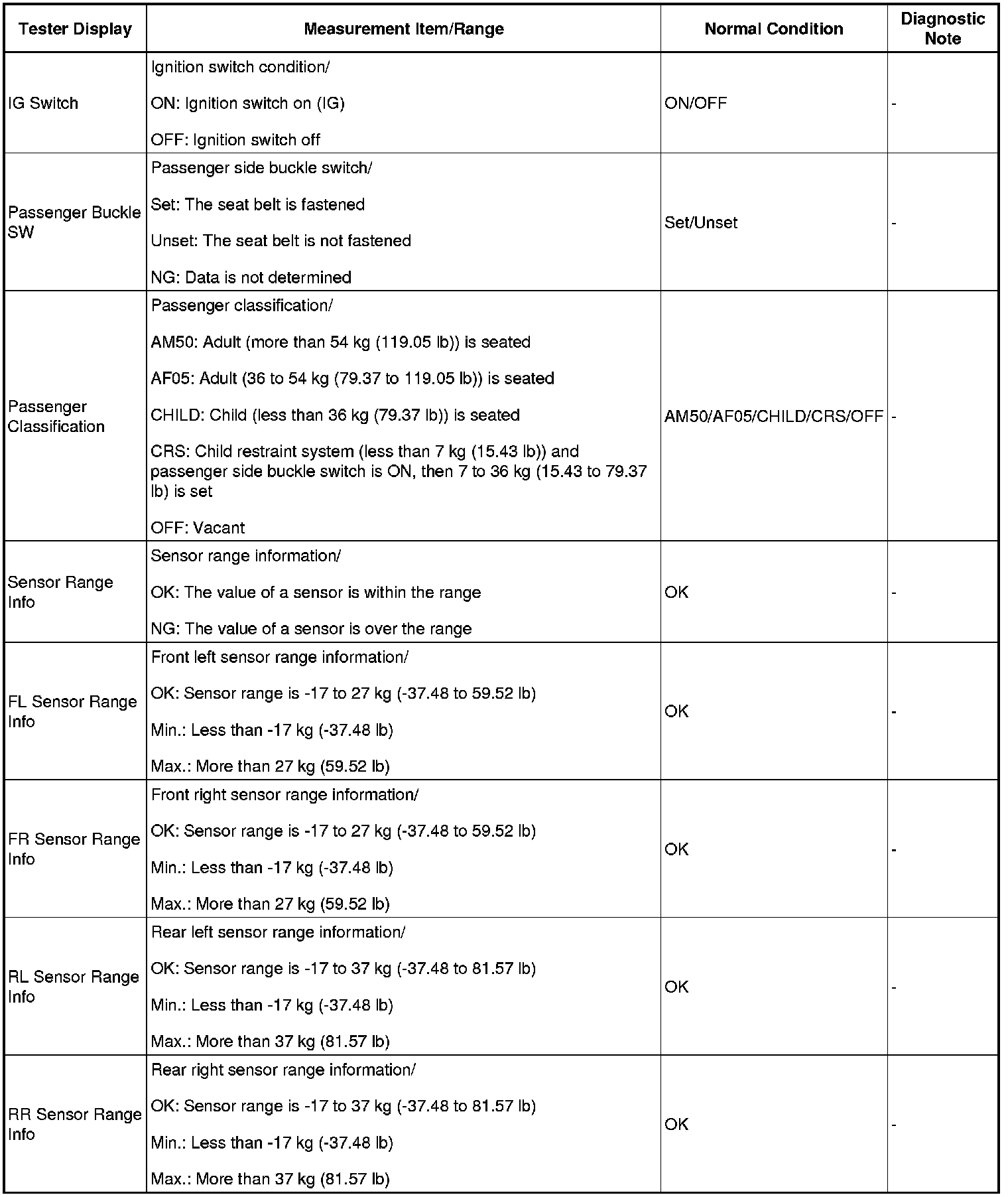 1. DATA LIST FOR OCCUPANT CLASSIFICATION ECU