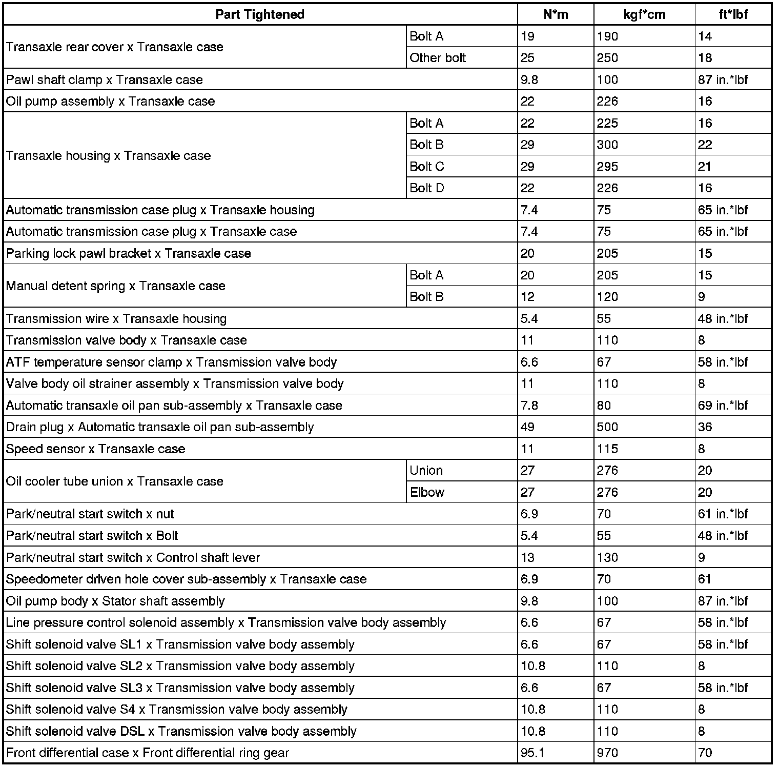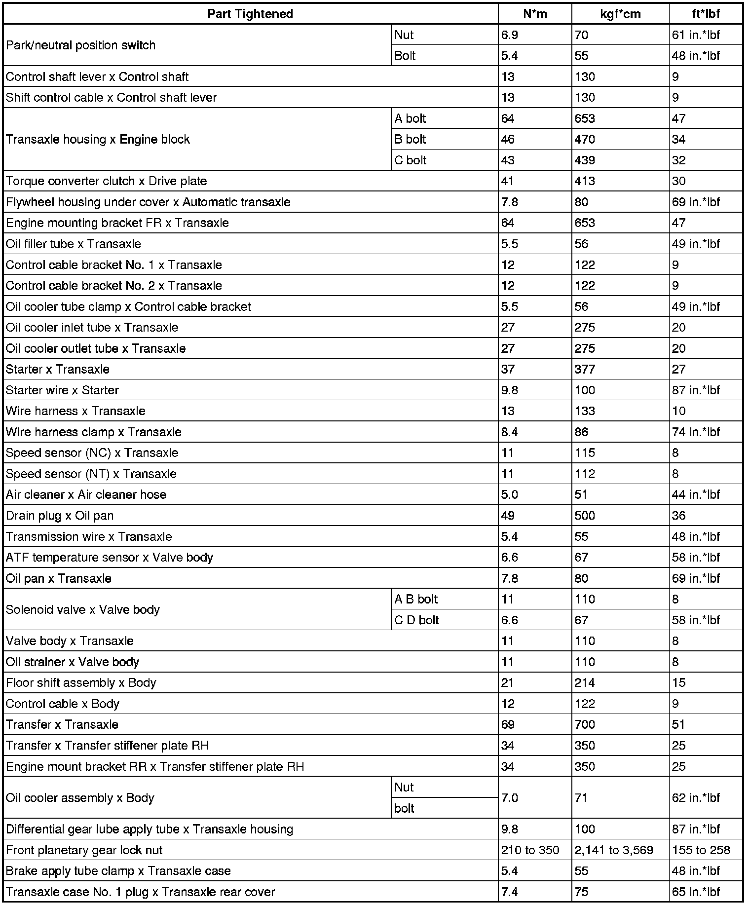 SERVICE SPECIFICATIONS: U151F AUTOMATIC TRANSAXLE: TORQUE SPECIFICATIONS