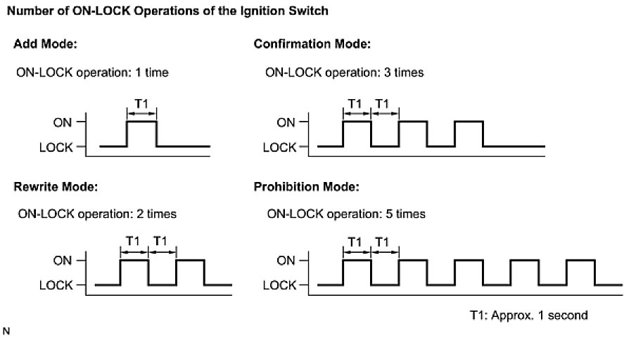 HINT: If the number of ON-LOCK operations of the ignition switch is 0, 4 or 6 or more, there will be no response (power door lock and unlock operation) to show which mode has been selected.