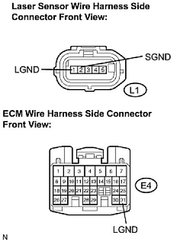 This circuit provides power to the laser sensor. The laser sensor emits radio waves towards an object in front and measures the distance and direction of the object by receiving the beam reflections. Based on the reflections, the sensor calculates the difference in speed between the vehicle and the object in front. This data is transmitted to the distance control ECU. The ECM recognizes the laser sensor via terminals LGND. If an open circuit occurs in the wire harness between terminals LGND, the ECM cannot recognize the laser sensor. The ECM will stop the control of the vehicle-to-vehicle distance control mode and only the constant speed control mode can be used.
