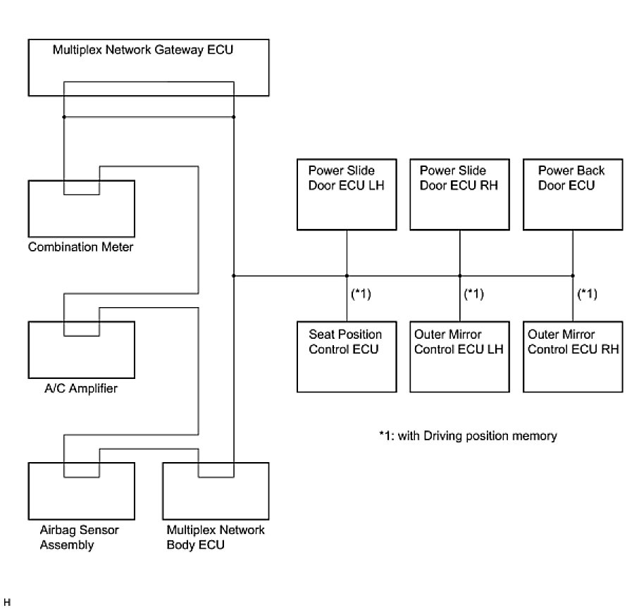 (a) The BEAN communication line is used to control the combination meter, the A/C amplifier, the airbag sensor assembly, the multiplex network body ECU, the power slide door ECU LH, the power slide door ECU RH, the power back door ECU, the seat position control ECU, the outer mirror control ECU LH, and the outer mirror ECU RH. If there is a short-circuit (bus-down) in the line, the communication to the system that has a short-circuit (bus-down) will be disabled and the DTC concerning the system will be output from the multiplex network gateway ECU.