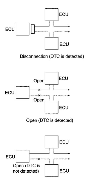 (b) If the DTC of ECU communication stop is output, connectors may be disconnected, or communication buses may be open at 2 points. It will not become abnormal with only 1 communication bus open.